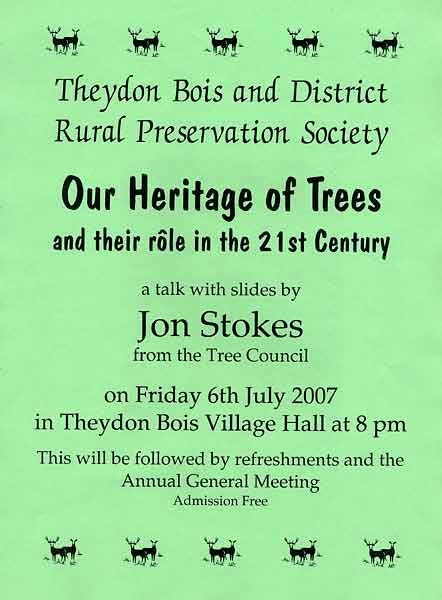 Month in Theydon (April/May/June): Trevor Roberts latest report is on line Click Here. Parish Council Minutes: The minutes for the meeting of the 29th March and 24th May are available. Click Here. The Parish Council Chairman Report:Robert Glozier's Report to the Parish Council 2007 AGM in March is available. Click Here. June 2007 Village News: The latest quarterly PDF version of Issue 58 of Village News is now available on line. Click Here. The Parish Council Chairman Report:Robert Glozier's Report to the Parish Council 2007 AGM in March is available. Click Here. Rural Preservation Society AGM & Talk: